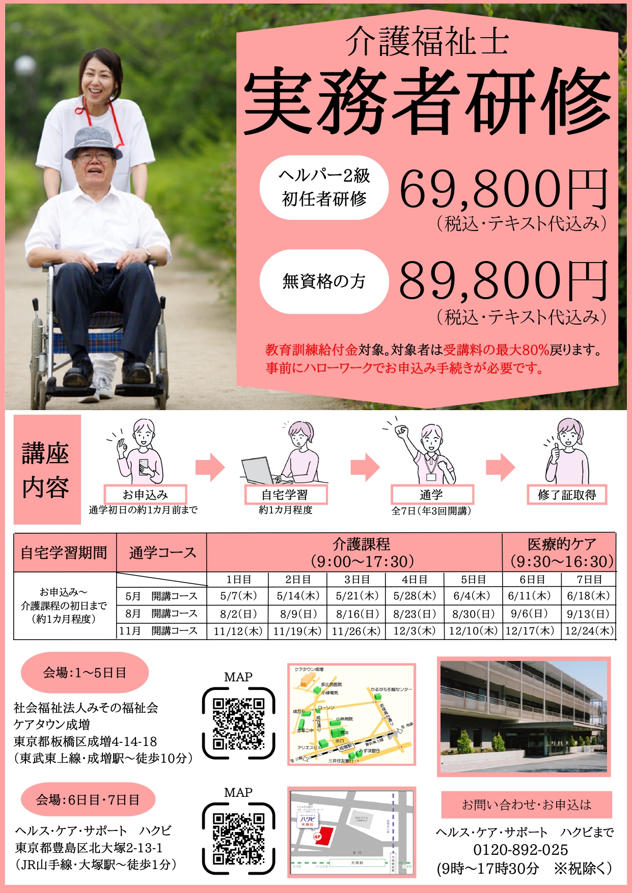 介護職員初任者・実務者研修ハクビ新着トピックスケアタウン成増会場の実務者 『実務者研修』ケアタウン成増会場(板橋区) ケアタウン成増会場での実務者研修は、自宅学習+スクーリング7日(毎週木曜日もしくは毎週日曜日)です。 お申し込み・お問い合わせは、ハクビフリーダイヤル(0120-892-025)までご連絡いただくか、HPの講座申込よりご連絡下さい。 ▶︎ 実務者研修とは? ▶︎ 介護福祉士実務者研修はこちら